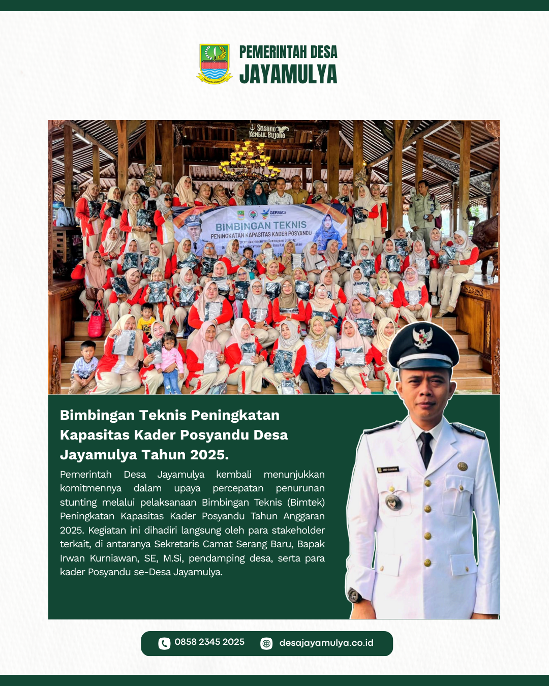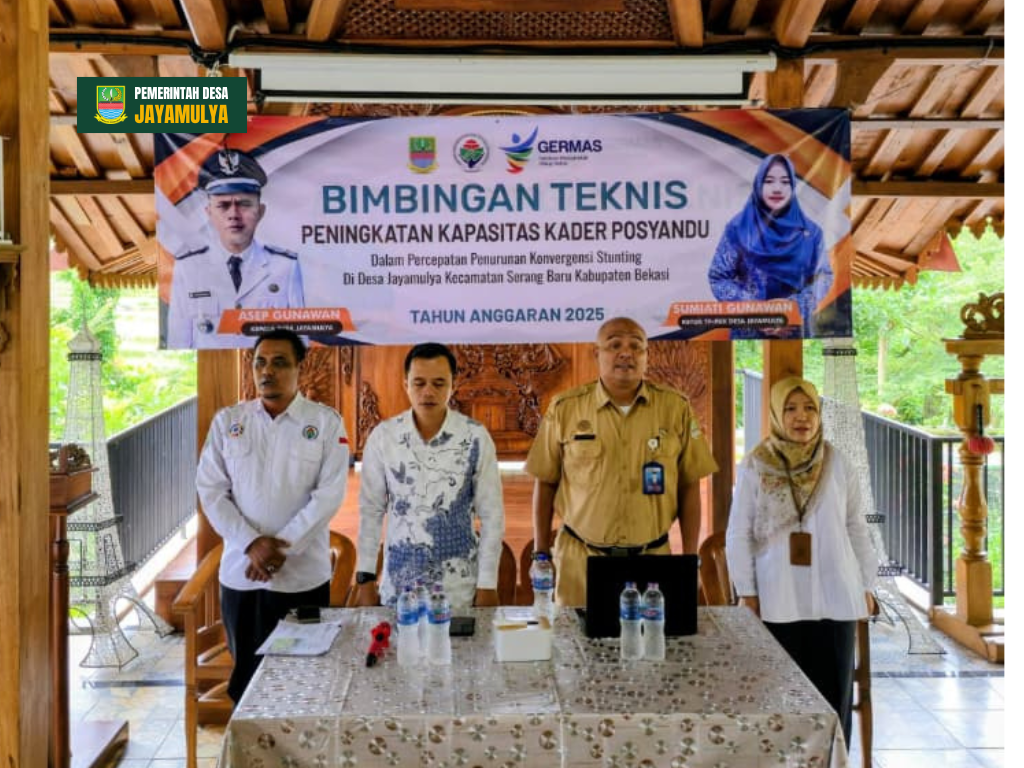 Pemerintah Desa Jayamulya kembali menunjukkan komitmennya dalam upaya percepatan penurunan stunting melalui pelaksanaan Bimbingan Teknis (Bimtek) Peningkatan Kapasitas Kader Posyandu Tahun Anggaran 2025. Kegiatan ini dihadiri langsung oleh para stakeholder terkait, di antaranya Sekretaris Camat Serang Baru, Bapak Irwan Kurniawan, SE, M.Si, pendamping desa, serta para kader Posyandu se-Desa Jayamulya.
