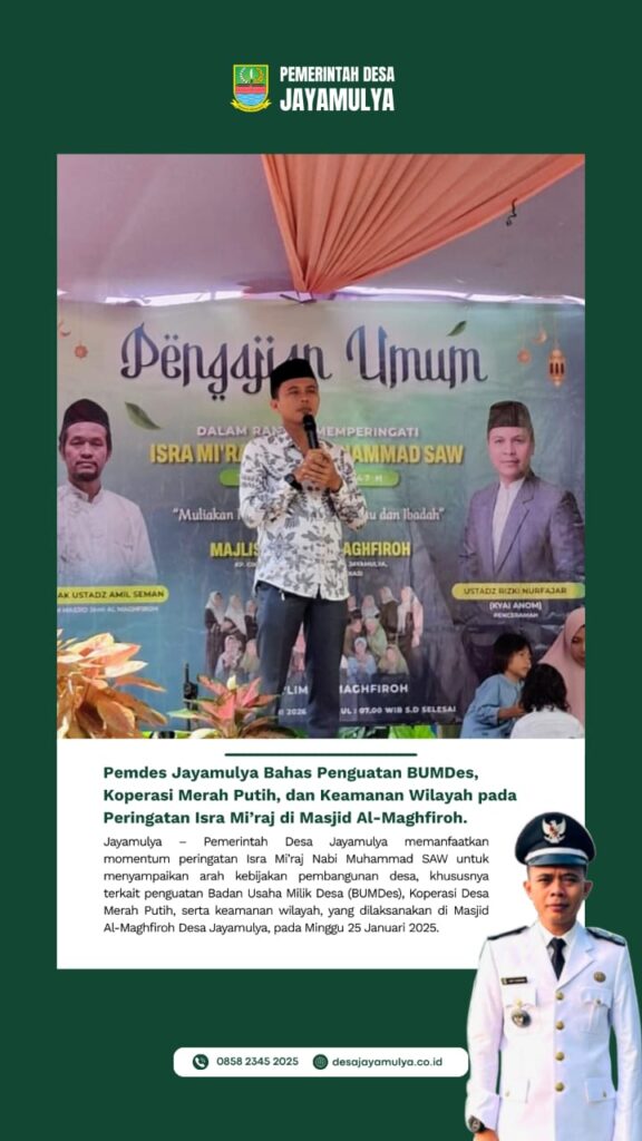 Jayamulya – Pemerintah Desa Jayamulya menghadiri sekaligus memanfaatkan momentum Pengajian Umum dalam rangka Peringatan Isra Mi’raj Nabi Muhammad SAW Tahun 1447 H / 2026 M yang diselenggarakan oleh Majlis Ta’lim Al Maghfiroh, bertempat di Masjid Jami Al Maghfiroh, Kampung Cikarang Hilir RT 05/03, Desa Jayamulya, Kecamatan Serang Baru, Kabupaten Bekasi, pada Minggu pagi (25/1/2026). Kegiatan […]
