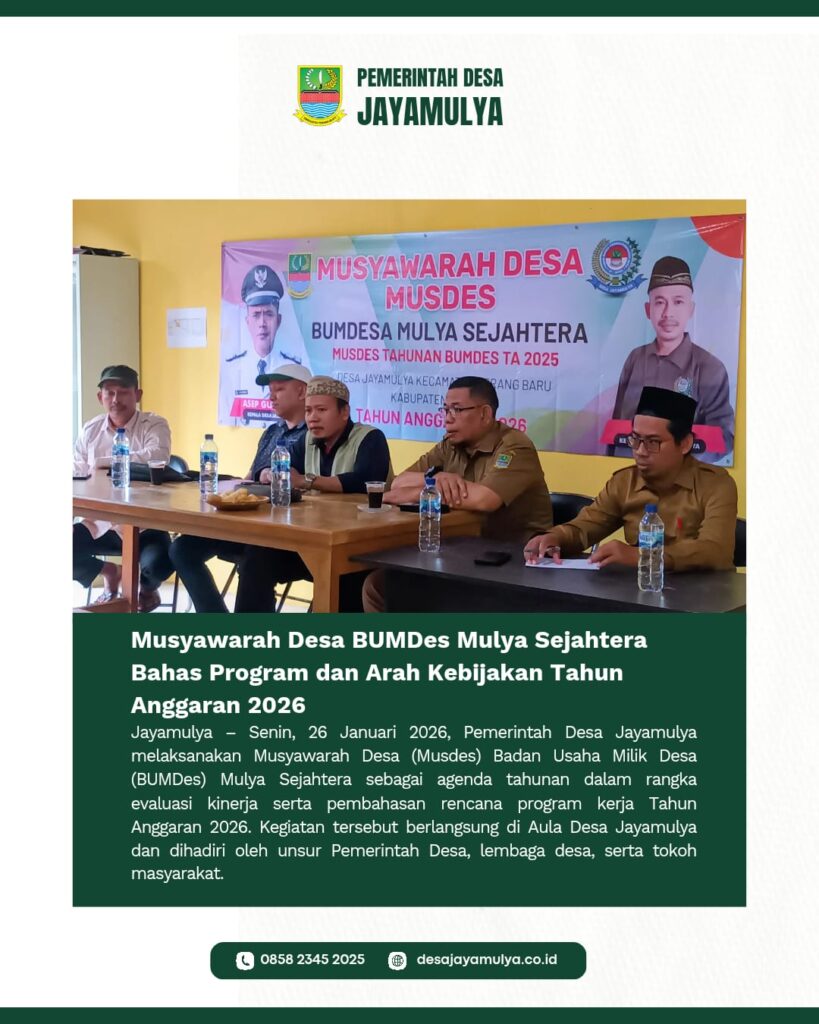 Jayamulya – Senin, 26 Januari 2026, Pemerintah Desa Jayamulya melaksanakan Musyawarah Desa (Musdes) Badan Usaha Milik Desa (BUMDes) Mulya Sejahtera sebagai agenda tahunan dalam rangka evaluasi kinerja serta pembahasan rencana program kerja Tahun Anggaran 2026. Kegiatan tersebut berlangsung di ruangan BPD Desa Jayamulya dan dihadiri oleh unsur Pemerintah Desa, lembaga desa, serta tokoh masyarakat. Musdes […]