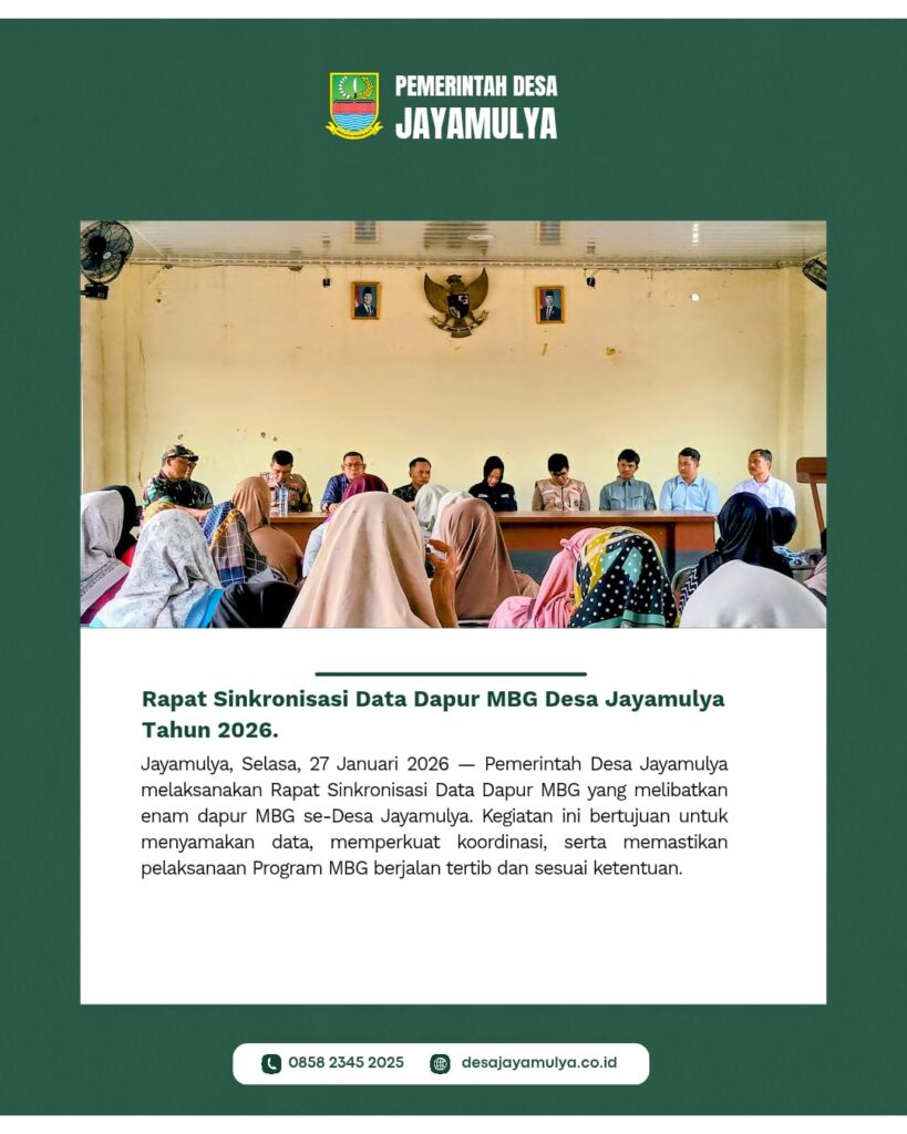 Jayamulya, Selasa, 27 Januari 2026 — Pemerintah Desa Jayamulya melaksanakan Rapat Sinkronisasi Data Dapur MBG Tahun 2026 yang melibatkan 5 dapur MBG se-Desa Jayamulya. Kegiatan ini bertujuan untuk menyamakan data, memperkuat koordinasi, serta memastikan pelaksanaan Program MBG berjalan tertib dan sesuai ketentuan. Rapat diselenggarakan di Aula Kantor Desa Jayamulya dan dihadiri oleh Sekretaris Desa Jayamulya […]