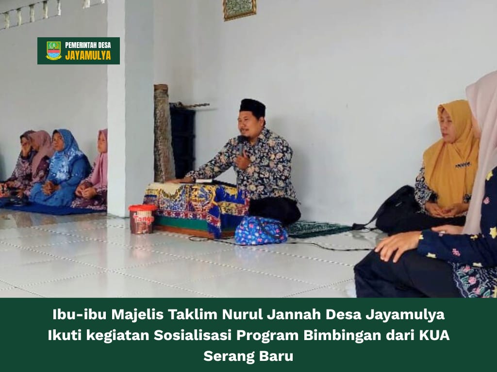 Jayamulya – Ibu-ibu Majelis Taklim Nurul Jannah Desa Jayamulya mengikuti kegiatan sosialisasi program pembinaan yang diselenggarakan oleh Kantor Urusan Agama (KUA) Kecamatan Serang Baru. Kegiatan ini bertujuan untuk memberikan pemahaman kepada masyarakat mengenai pentingnya pembinaan remaja serta persiapan dalam membangun keluarga yang harmonis.