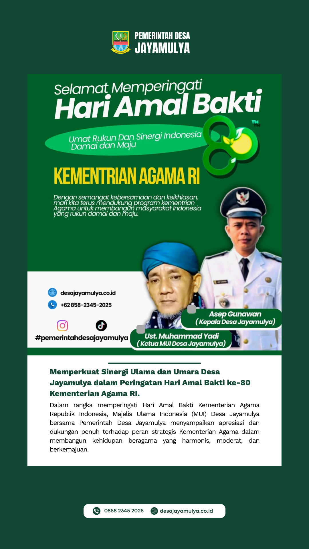 Dalam rangka memperingati Hari Amal Bakti Kementerian Agama Republik Indonesia, Majelis Ulama Indonesia (MUI) Desa Jayamulya Ust. Muhammad Yadi (Ketua MUI) bersama Pemerintah Desa Jayamulya yang dipimpin oleh kepala Desa Jayamulya (Asep Gunawan) menyampaikan apresiasi dan dukungan penuh terhadap peran strategis Kementerian Agama dalam membangun kehidupan beragama yang harmonis, moderat, dan berkemajuan. Hari Amal Bakti merupakan momentum reflektif untuk meneguhkan kembali komitmen seluruh elemen bangsa dalam memperkuat kerukunan umat beragama, meningkatkan kualitas pelayanan keagamaan, serta memperkokoh nilai-nilai kebangsaan dalam bingkai Negara Kesatuan Republik Indonesia.