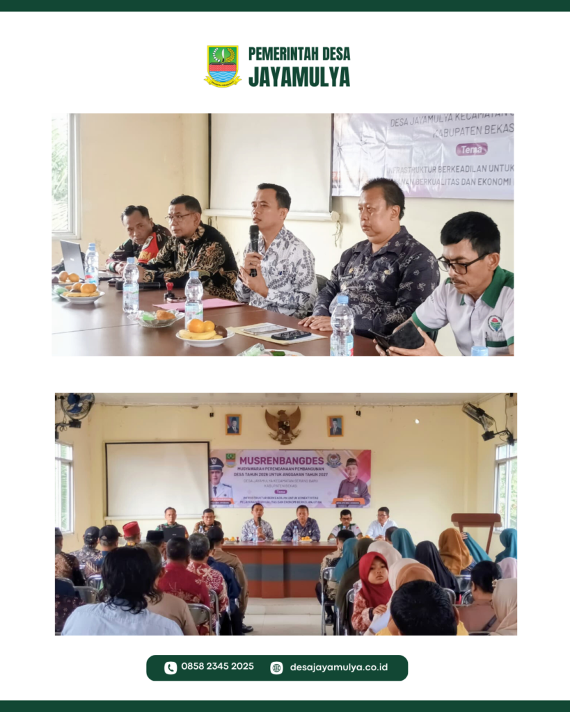 Jayamulya, Kamis (15 Januari 2026) — Pemerintah Desa Jayamulya melaksanakan Musyawarah Perencanaan Pembangunan Desa (Musrenbangdes) Tahun 2026 untuk penyusunan Rencana Kerja Pemerintah Desa (RKPDes) Tahun Anggaran 2027, bertempat di Aula Kantor Desa Jayamulya, Kecamatan Serang Baru, Kabupaten Bekasi.