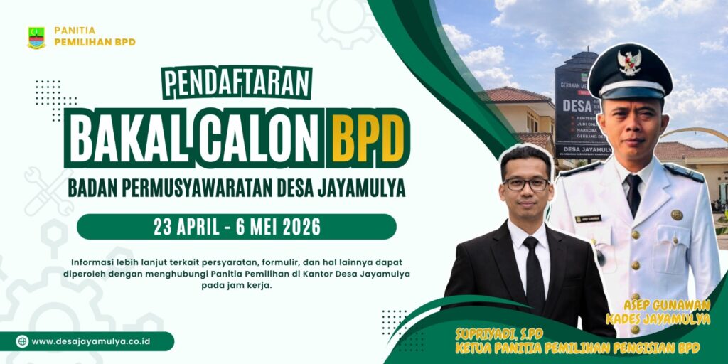 Pendaftaran Bakal Calon Anggota BPD Desa Jayamulya dibuka mulai 23 April hingga 6 Mei 2026. Selama masa pendaftaran tersebut, masyarakat yang memenuhi persyaratan dipersilakan untuk mendaftarkan diri melalui Panitia Pemilihan BPD di Kantor Desa Jayamulya pada jam kerja.
