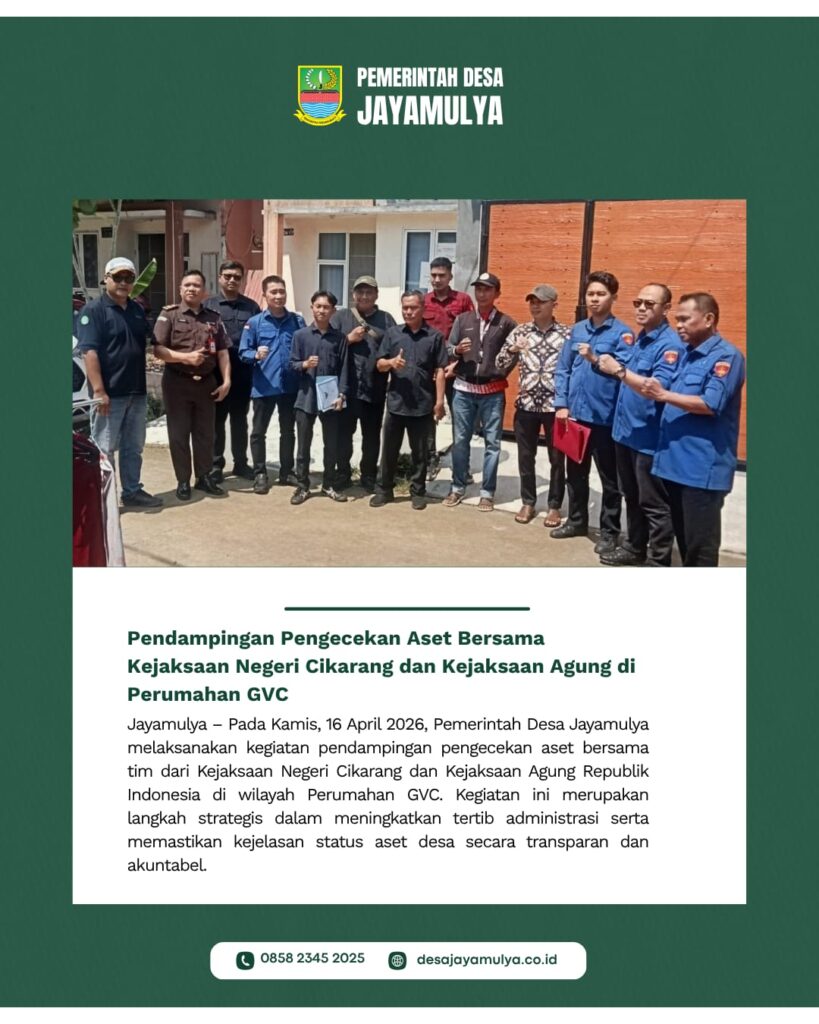 Jayamulya – Kamis, 16 April 2026, Pemerintah Desa Jayamulya melaksanakan kegiatan pendampingan pengecekan aset bersama tim dari Kejaksaan Negeri Cikarang dan Kejaksaan Agung Republik Indonesia di wilayah Perumahan GVC. Kegiatan ini merupakan langkah strategis dalam meningkatkan tertib administrasi serta memastikan kejelasan status aset desa secara transparan dan akuntabel.