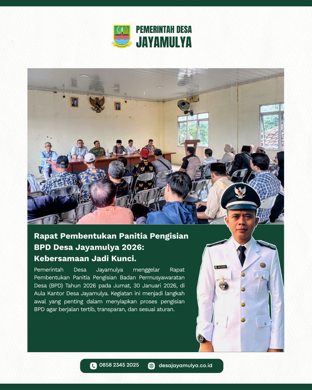 Pemerintah Desa Jayamulya menggelar Rapat Pembentukan Panitia Pengisian Badan Permusyawaratan Desa (BPD) Tahun 2026 pada Jumat, 30 Januari 2026, di Aula Kantor Desa Jayamulya. Kegiatan ini menjadi langkah awal yang penting dalam menyiapkan proses pengisian BPD agar berjalan tertib, transparan, dan sesuai aturan.