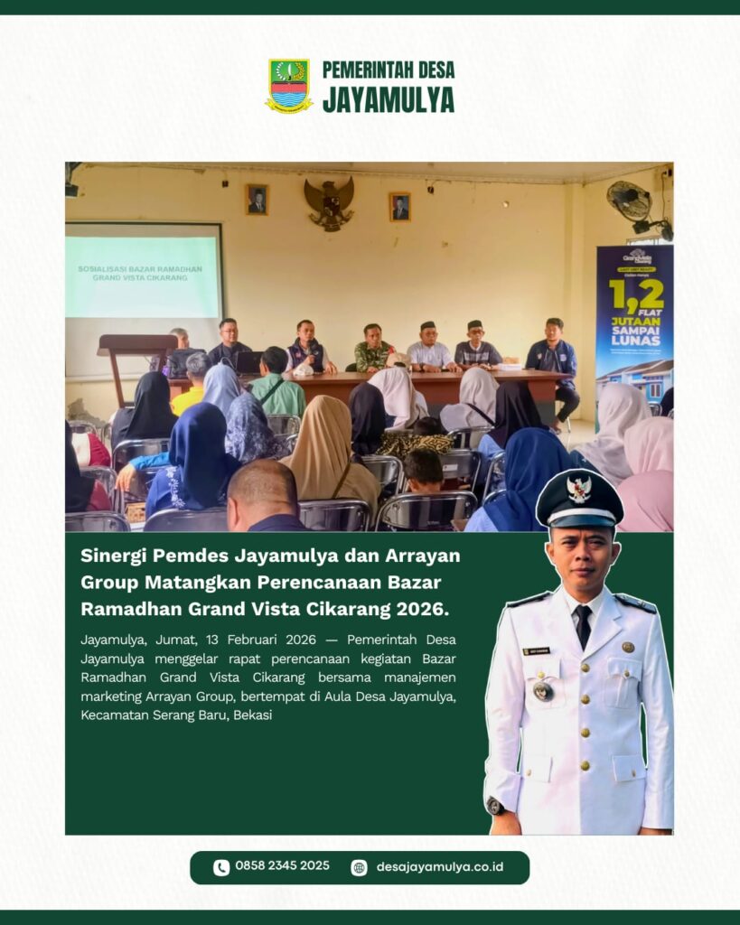 Jayamulya, Jumat, 13 Februari 2026 — Pemerintah Desa Jayamulya menggelar rapat perencanaan kegiatan Bazar Ramadhan Grand Vista Cikarang bersama manajemen marketing Arrayan Group, bertempat di Aula Desa Jayamulya, Kecamatan Serang Baru.