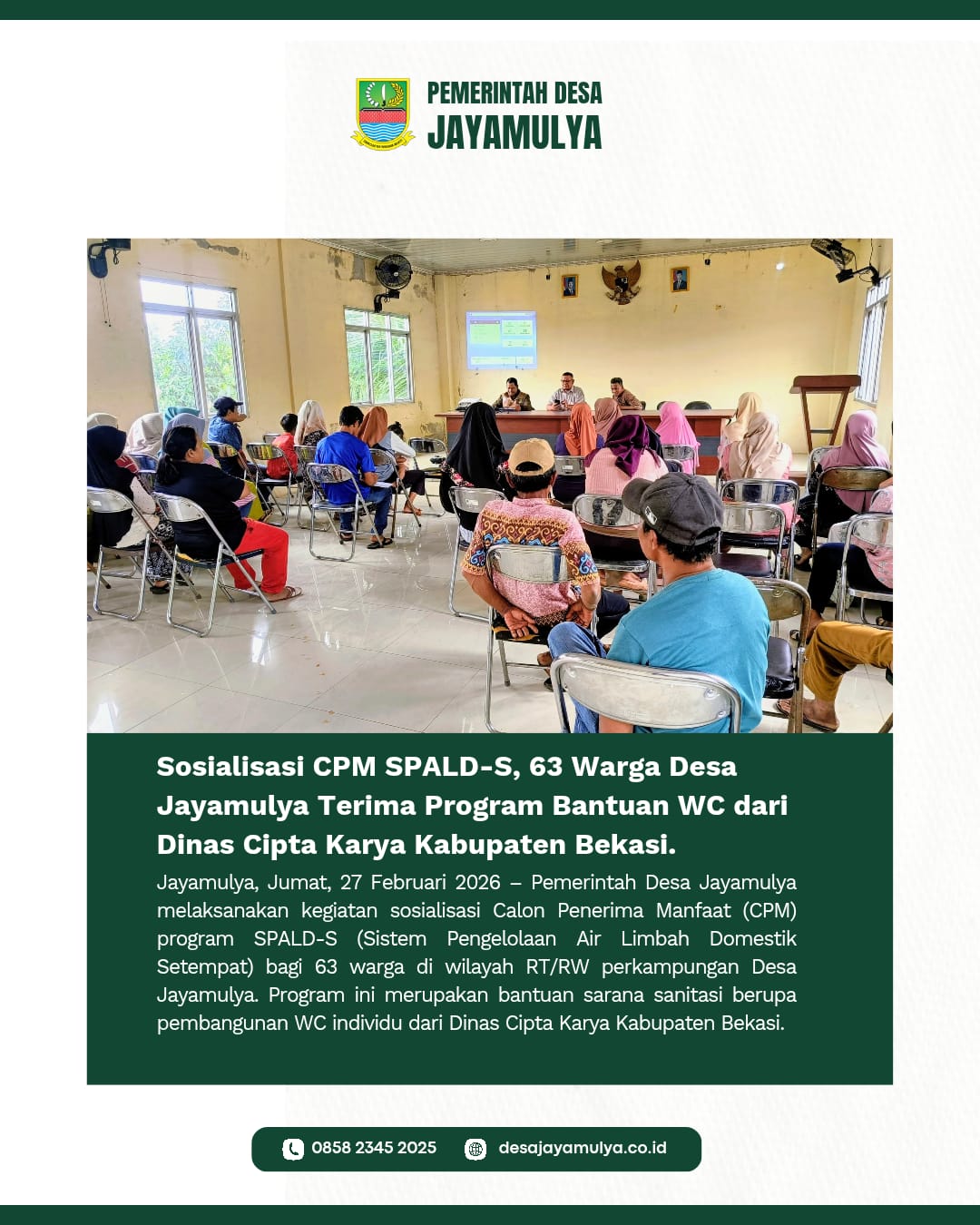 Jayamulya, Jumat, 27 Februari 2026 – Pemerintah Desa Jayamulya melaksanakan kegiatan sosialisasi Calon Penerima Manfaat (CPM) program SPALD-S (Sistem Pengelolaan Air Limbah Domestik Setempat) bagi 63 warga di wilayah RT/RW perkampungan Desa Jayamulya. Program ini merupakan bantuan sarana sanitasi berupa pembangunan WC individu dari Dinas Cipta Karya Kabupaten Bekasi.