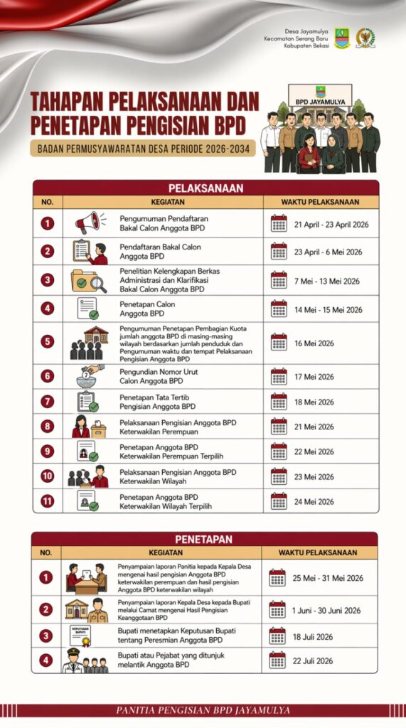 Jayamulya, 23 April 2026 – Pemerintah Desa Jayamulya, Kecamatan Serang Baru, Kabupaten Bekasi, melalui Panitia Pengisian Badan Permusyawaratan Desa (BPD), secara resmi mengumumkan tahapan pelaksanaan dan penetapan pengisian anggota BPD Desa Jayamulya untuk periode 2026–2034. Pengumuman ini bertujuan memberikan informasi yang jelas kepada masyarakat mengenai alur dan jadwal pelaksanaan pengisian anggota BPD secara transparan dan terstruktur.